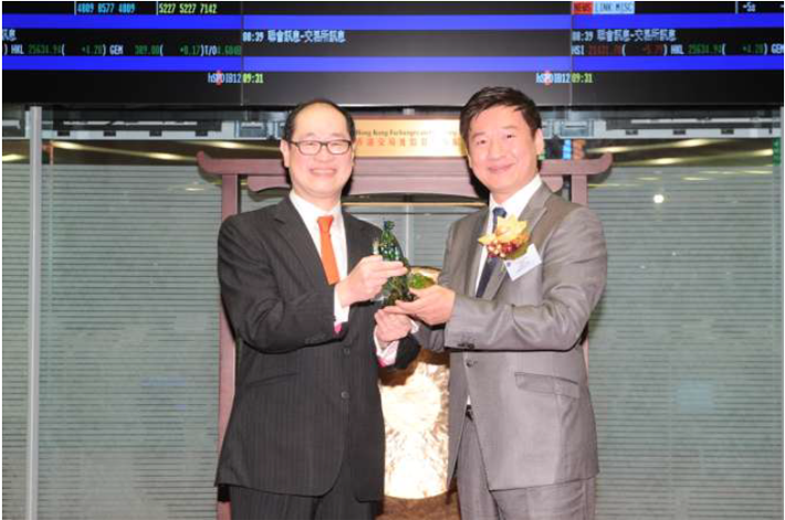 中國鋁罐控股有限公司執行董事兼主席連運增先生(右)至送紀念品予香港聯合交易所代表 上市委員會主席李嘉士先生(左)
