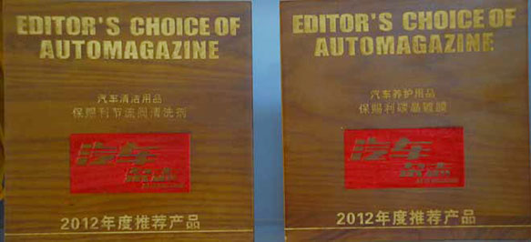 11月21日晚,2012《汽車雜志》年度產品頒獎典禮在廣州迎賓路四桂堡酒莊舉行舉行,國內汽車各行業企業代表精英都應邀出席了此次晚會。《汽車雜志》在延續往屆“推薦品牌”活動輝煌基礎上,堅持客觀、公正原則推出“2012《汽車雜志》年度推薦產品”,旨在為消費者提供專業的購買指南,以及表彰本行業具有影響力的產品。保賜利“碳晶鍍膜”、“節流閥清洗劑”均因質量、設計、技術含量、售后服務等方面有突出表現,力壓群雄,分別榮獲2012年度汽車養護用品、清潔用品“年度推薦產品”。