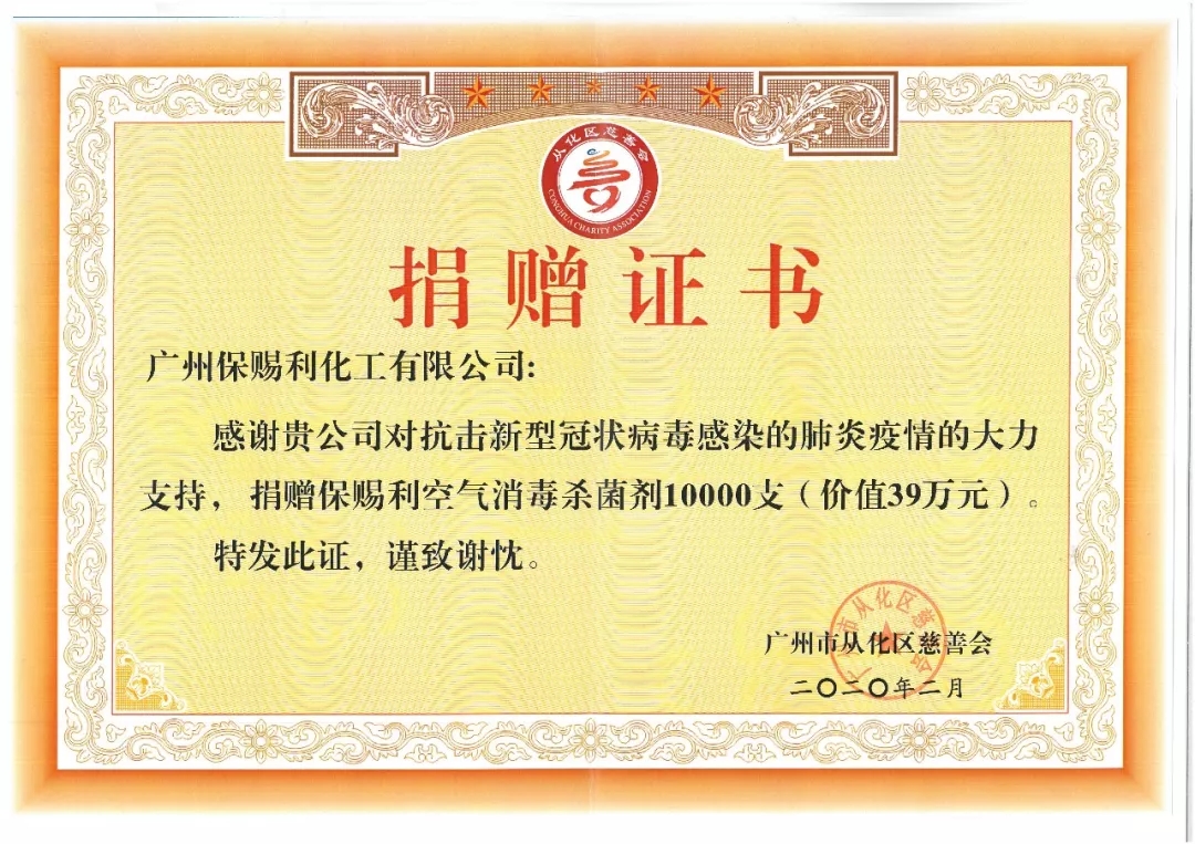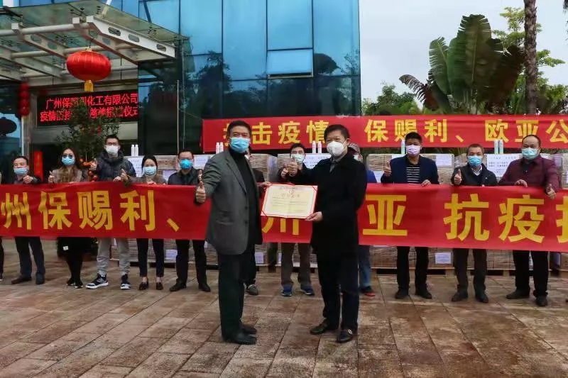 隨著新型冠狀病毒感染肺炎疫情進一步發展,抗疫前線急需大量抗疫物資。香港主板上市企業保寶龍科技控股有限公司(1861.HK)旗下2家全資子公司廣州保賜利化工有限公司、廣州歐亞氣霧劑與日化用品制造有限公司用積極行動響應政府號召;廣州保賜利繼2月1日捐贈首批物資泰國產醫護型口罩后,于2月6日又聯合廣州歐亞向廣州市從化區慈善會捐贈第二批物資;保賜利75%酒精消毒多功能噴霧、保賜利空氣消毒殺菌劑各10000瓶,總價值78萬元人民幣,用于抗擊新冠肺炎疫情。捐贈廣州從化的第三批物資正在加緊準備之中,力爭近日送達。