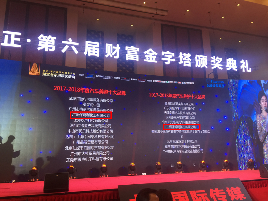 在全行業(yè)聚焦的盛會上,在中國汽車后市場行業(yè)精英、媒體朋友們的共同見證下,保賜利憑借強大的品牌實力榮獲“2017-2018年度汽車美容十大品牌”和“2017-2018年度汽車養(yǎng)護十大品牌”榮譽。