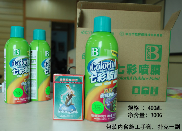 七彩噴膜是一種自然干燥的人造橡膠涂覆層,適用于各種金屬、塑料、木制品等表面,噴涂后可在物體表面形成一種柔韌可剝離的有色薄膜,保護物體表面,防水、耐磨,多種顏色可選(熒光綠、熒光金黃、熒光藍、熒光桃紅、熒光紅、熒光橙、熒光紫),具有很好的美化裝飾性?墒褂糜谄、摩托車、自行車的金屬構件和烤漆表面的改色,也可使用在木材、玻璃、塑料、混凝土、布料、皮制品、陶瓷等需要改色的表面上。